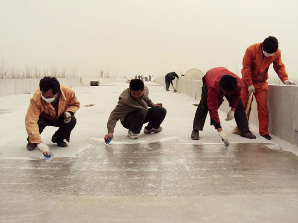 5、在硬化劑地面完成收光作業后為防止其表面水份的集聚蒸發,在12小時內視其地面及當時空氣濕度, 對硬化表面層進行水養護或專用養護劑養護。